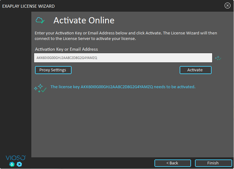 1. After an order is placed, the activation key is created by VIOSO according to the order specification and transmitted to you typically via E-mail.